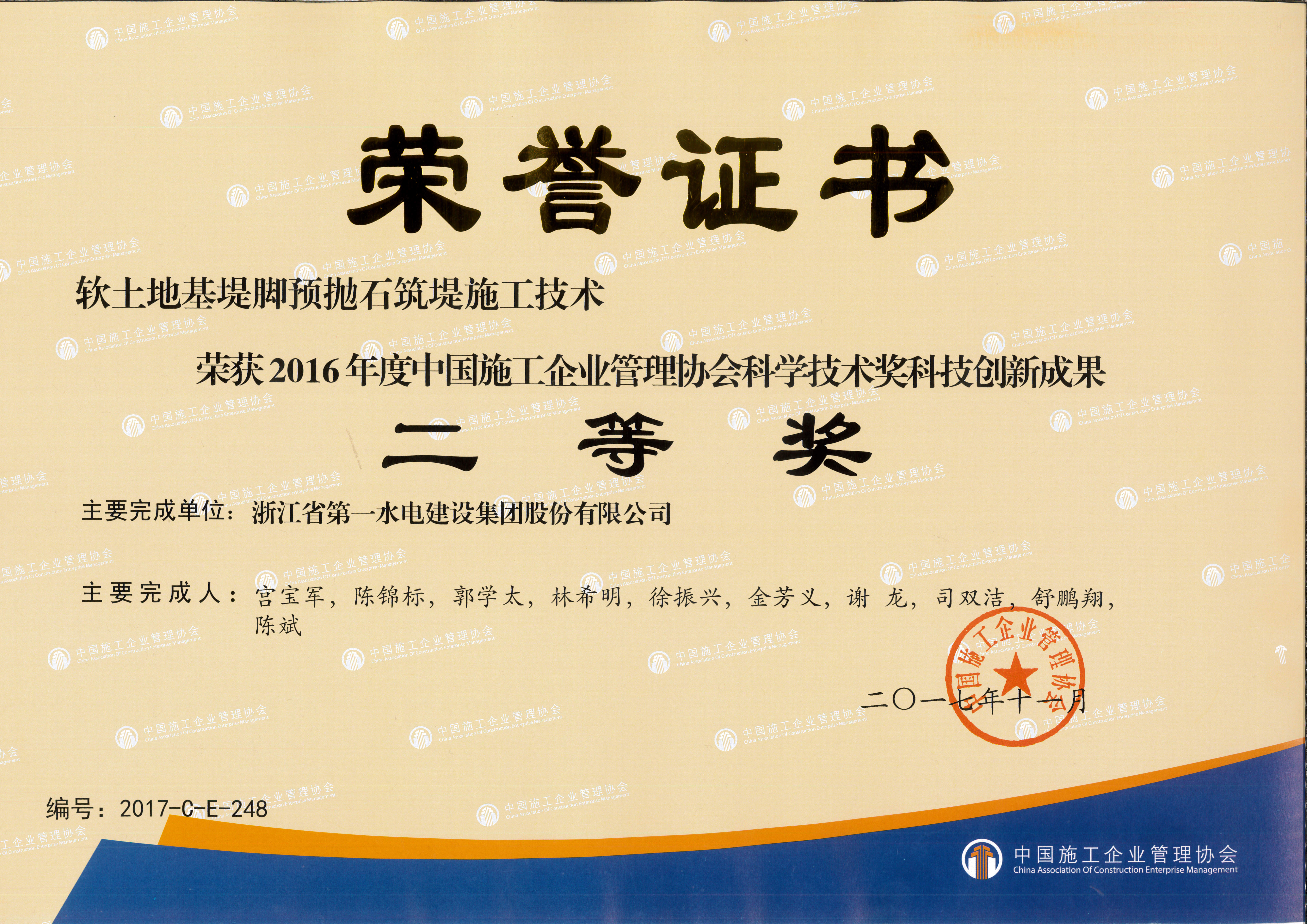 中國(guó)施工企業(yè)管理協(xié)會(huì)科技創(chuàng)新二等獎(jiǎng)——軟土地基堤腳預(yù)拋石筑堤施工技術(shù)