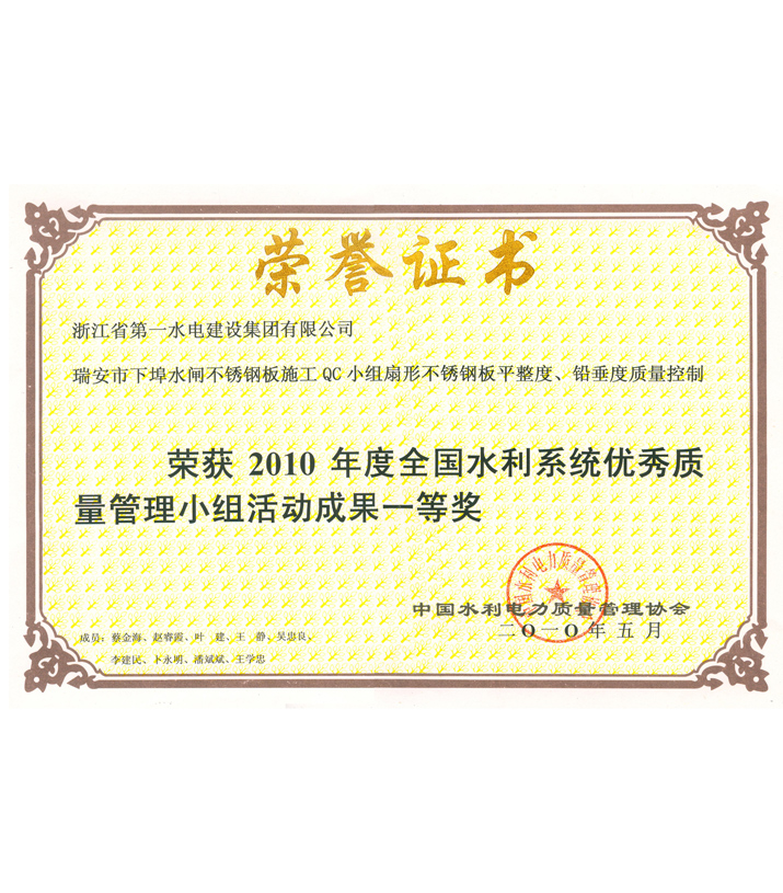 全國(guó)水利系統(tǒng)優(yōu)秀質(zhì)量管理小組活動(dòng)成果一等獎(jiǎng)——瑞安市下埠水閘不銹鋼板施工QC小組扇形不銹鋼板平整度、鉛垂度質(zhì)量控制(2010)
