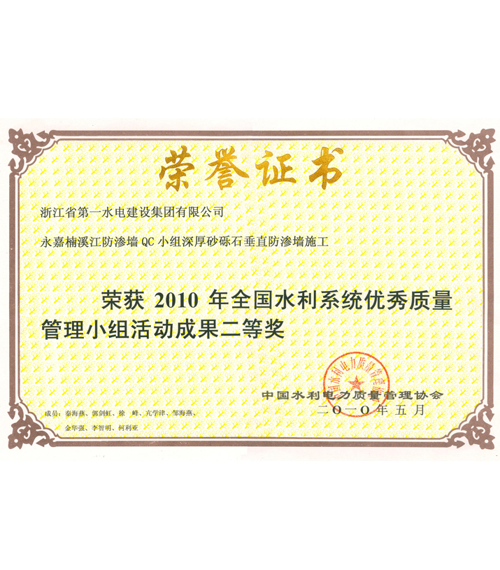 全國(guó)水利系統(tǒng)優(yōu)秀質(zhì)量管理小組活動(dòng)成果二等獎(jiǎng)——永嘉楠溪江防滲墻QC小組深厚砂礫石垂直防滲墻施工(2010)