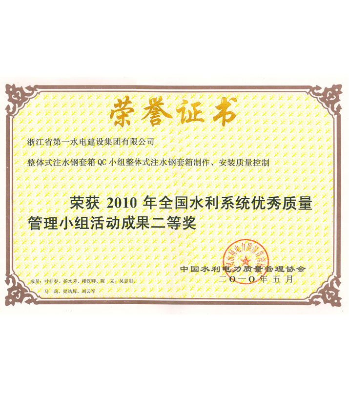 全國(guó)水利系統(tǒng)優(yōu)秀質(zhì)量管理小組活動(dòng)成果二等獎(jiǎng)——整體式注水鋼套箱QC小組整體式注水鋼套箱制作、安裝質(zhì)量控制(2010)