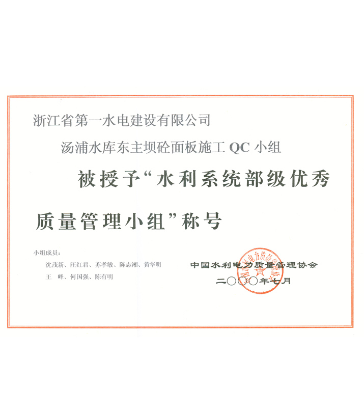 水利系統(tǒng)部級(jí)優(yōu)秀質(zhì)量管理小組——湯浦水庫(kù)東主壩砼面板施工QC小組(2000)