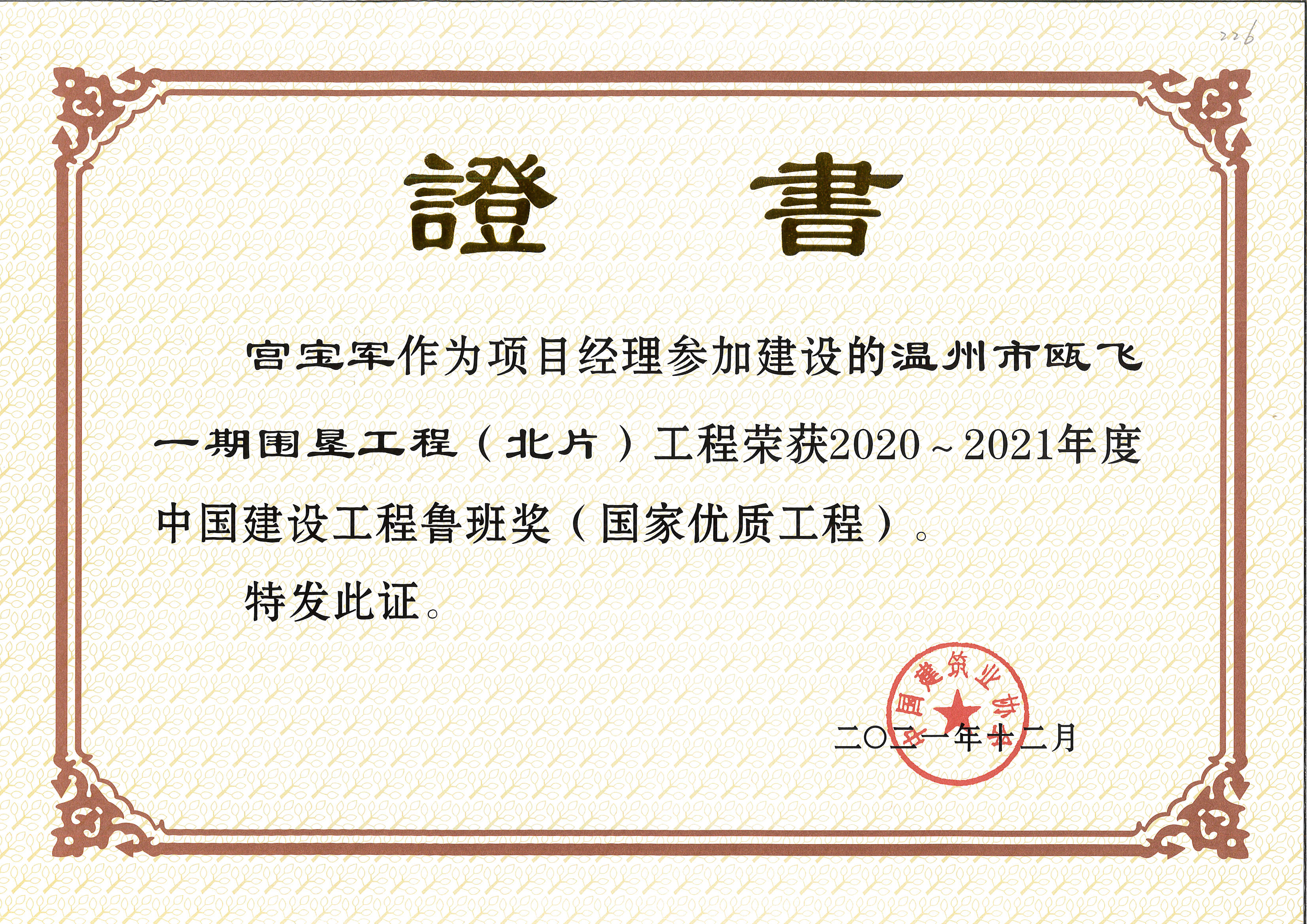 宮寶軍項目經理-溫州市歐飛一期圍墾工程魯班獎
