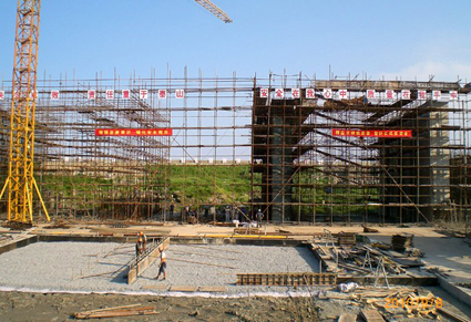 杭嘉湖南排獨山排澇應(yīng)急工程IV標排澇閘工程位于嘉興平湖市,距平湖市約為12公里,獨山排澇閘規(guī)模為凈寬40米,設(shè)3孔,各孔凈寬為14米、12米、14米,閘室順水流方向長度為22米,閘室總寬度為92米。目前已完成閘室、上游翼墻段、下游口門段等部位的基礎(chǔ)灌注樁施工,閘室段閘底板、右岸通航孔閘墩施工及上游翼墻段扶臂式翼墻、砼護坦等施工。工程預(yù)計在2011年11月全部完工。