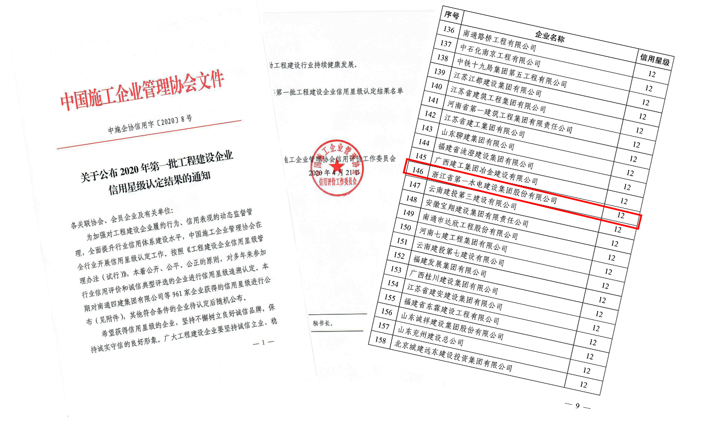 近期,中國(guó)施工企業(yè)管理協(xié)會(huì)發(fā)布2020年第一批工程建設(shè)企業(yè)信用星級(jí)認(rèn)定結(jié)果名單,在961家企業(yè)中,集團(tuán)公司以良好的企業(yè)信譽(yù)獲得累計(jì)信用星級(jí)12星。
