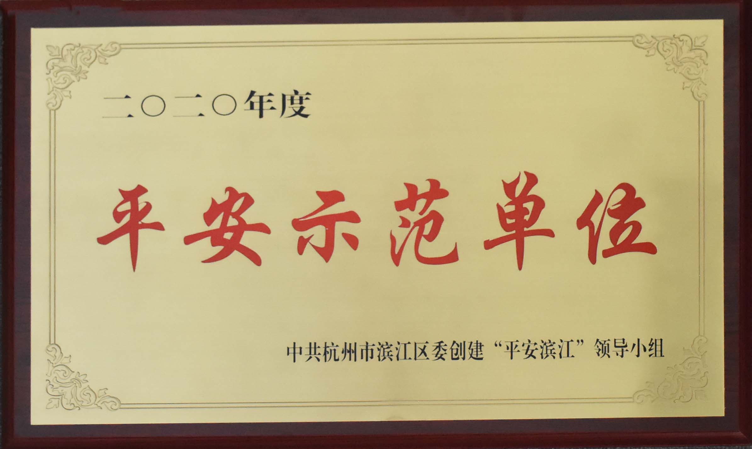 近日,公司被中共杭州濱江區(qū)委創(chuàng)建“平安濱江”領(lǐng)導(dǎo)小組授予2020年度濱江區(qū)“平安示范單位”稱號(hào)。