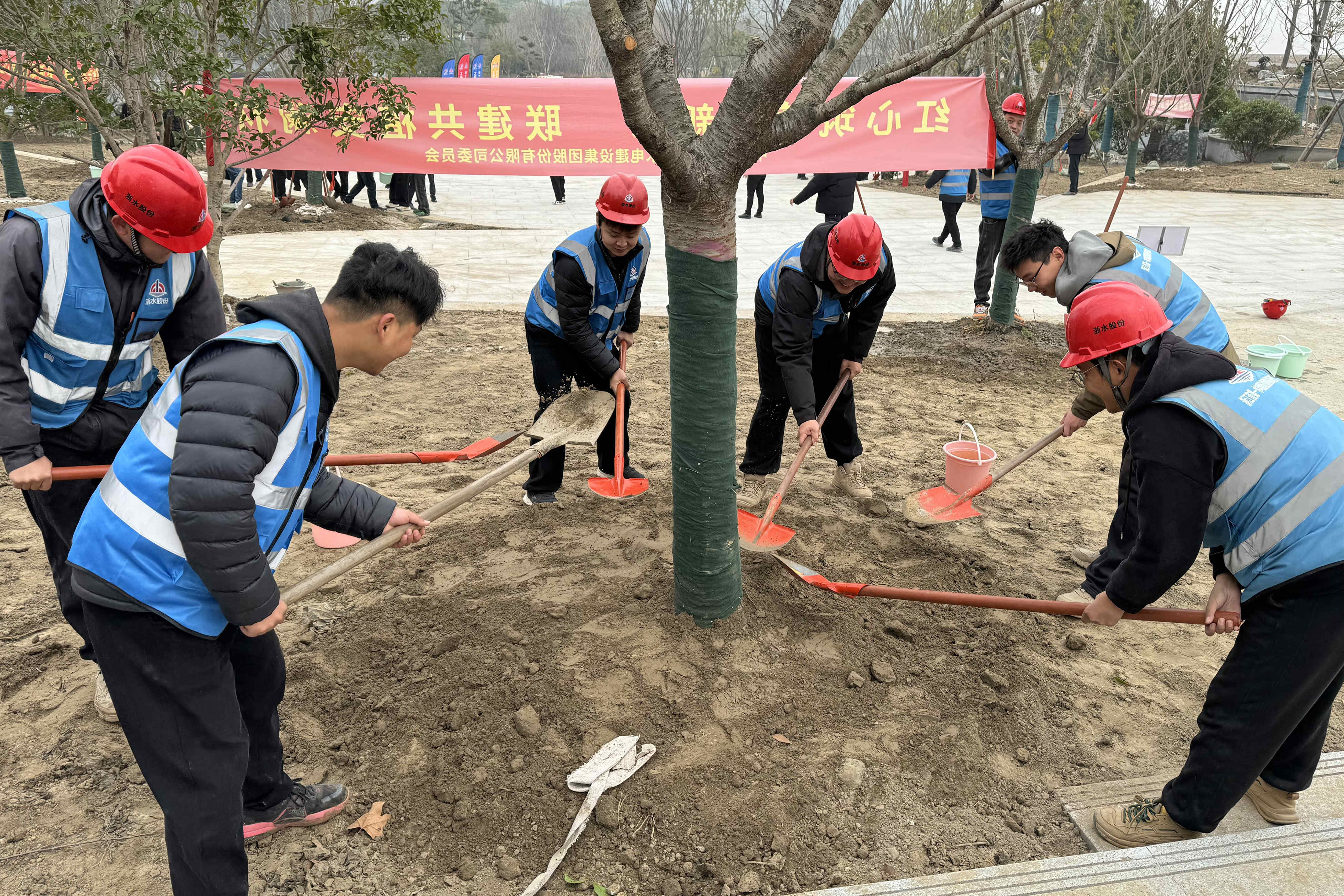活動現(xiàn)場,黨員先鋒們帶頭示范,與管理人員和一線建設者們并肩作戰(zhàn),百余人的植樹方陣如火如荼、干勁十足。鐵鍬在他們的手中劃出利落的弧線,鍬尖破開濕潤的泥土,卷起一層層泛著潮氣的褐色土浪。有人弓步夯實土壤,有人拎著水桶精心澆灌……安全帽下,他們的褲腳沾滿泥點也渾然不覺。從挖坑、栽苗、澆水到掛牌,每一道工序都凝聚著大家對綠色未來的期待。