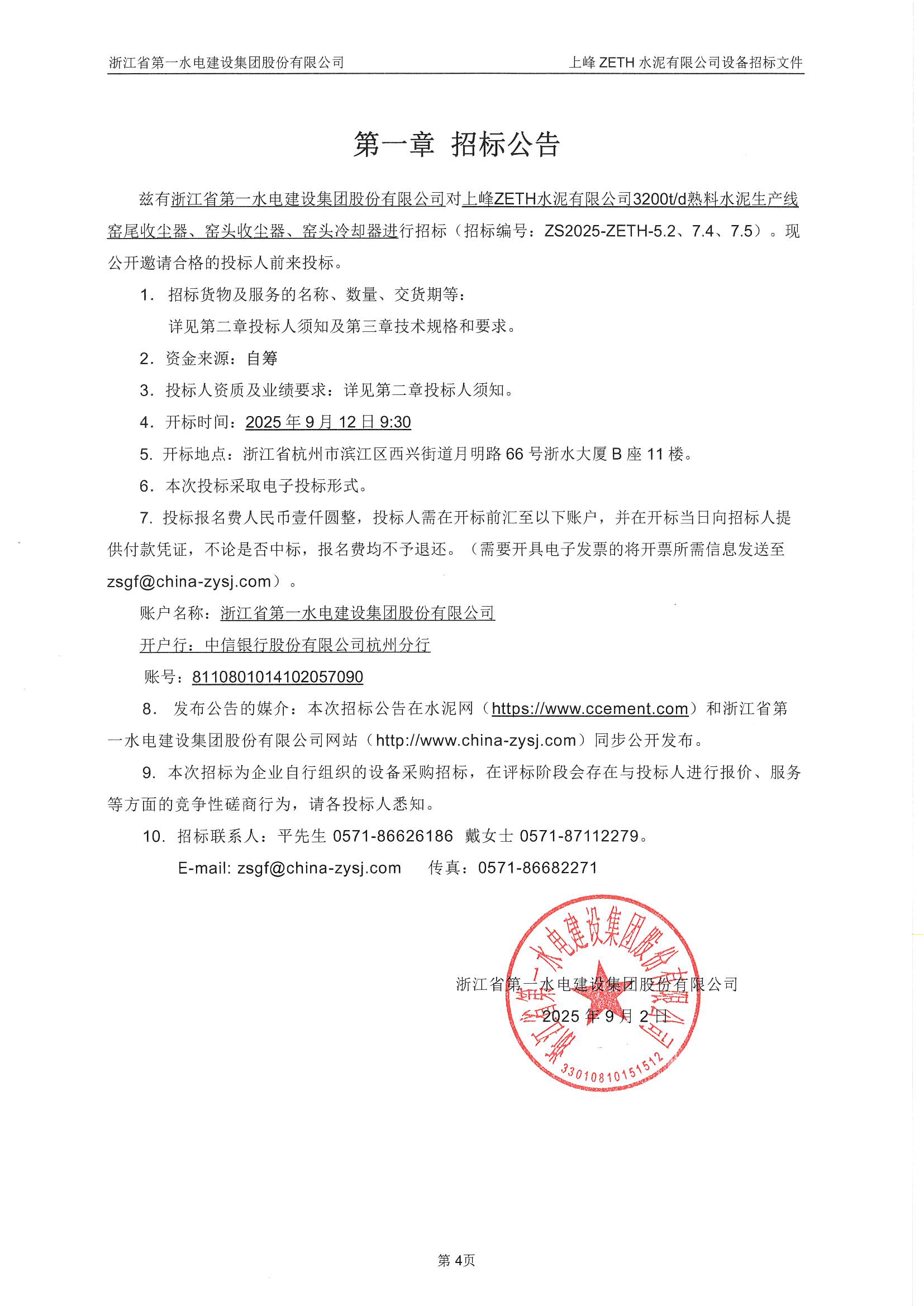 上峰ZETH水泥有限公司3200t/d熟料水泥生產(chǎn)線(xiàn)窯尾收塵器、窯頭收塵器、窯頭冷卻器采購(gòu)招標(biāo)